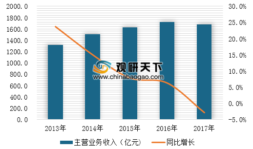 2016年以前,中國玻璃纖維行業(yè)主營業(yè)務(wù)收入持平穩(wěn)增長態(tài)勢,2017年,受下游行業(yè)建材領(lǐng)域經(jīng)濟效益下滑的影響,玻璃纖維主營業(yè)務(wù)收入有所下滑。2017年,中國玻璃纖維行業(yè)主營業(yè)務(wù)收入為1674億元,同比下降3%。