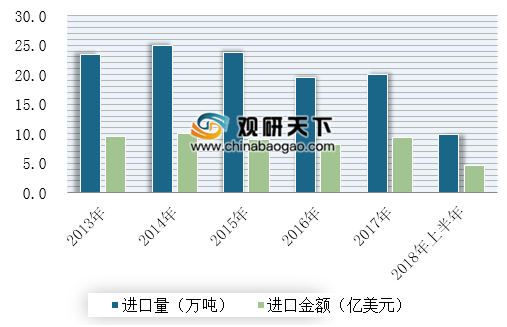 玻璃纖維及其制品進口情況,2014年之后,中國玻璃纖維及其制品進口量和進口金額呈下降趨勢。2017年,國內(nèi)需求旺盛,進口量及進口金額開始回暖;其中進口量為20萬噸,同比增長2.5%,進口金額為9.3億美元,同比增長13.6%。2018年上半年,玻璃纖維及制品進口量為9.8萬噸,進口產(chǎn)品金額4.6億美元。
